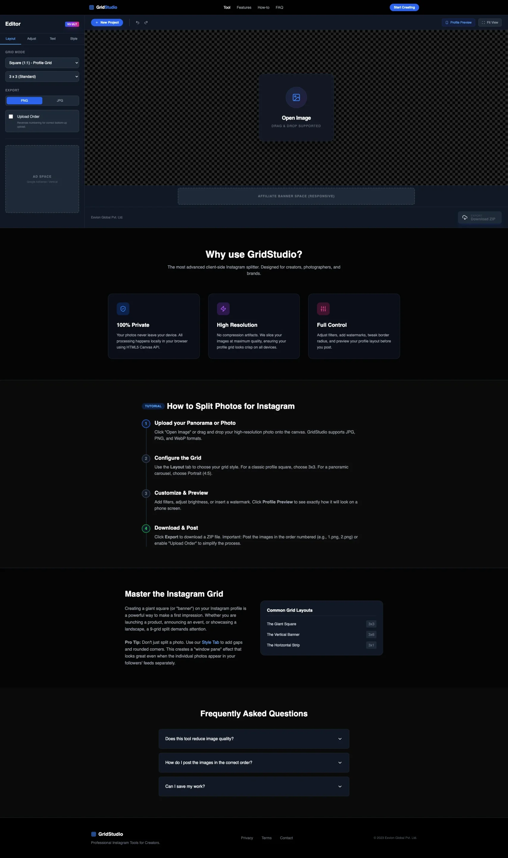 A professional Instagram grid-maker that lets creators, influencers, and brands split any photo into perfect high-resolution Instagram grids. No apps, no accounts, no quality loss.