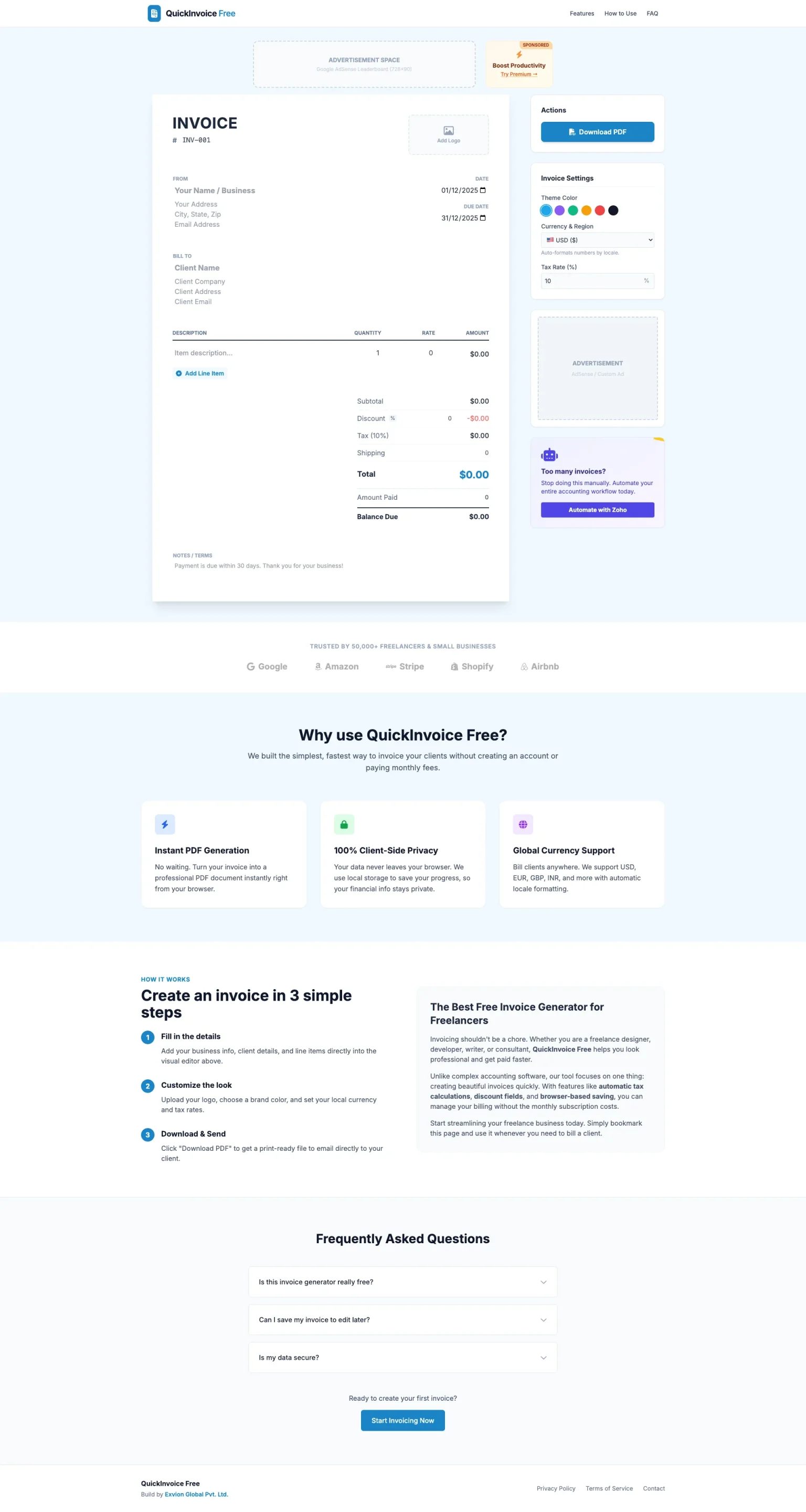 A simple, fast, and professional invoice creation tool designed for freelancers, agencies, and small businesses. No accounts, no subscriptions—just instant, beautiful invoices.